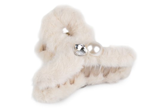 Skřipec do vlasů kožešinový s perlou a broušeným kamenem - béžová světlá