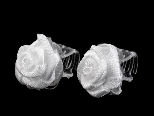 Jemné textilní růžičky vám elegantně ozdobí účes. Jsou uchycené na transparentní mini sponce (skřipci). Jsou vhodné pro všechny slavnostní události, především se hodí k ozdobení svatebního účesu a pro družičky. Skřipec je vyrobený z pružného materiálu, není náchylný k prasknutí. [Kvalita růžičky je výborná, kvalita skřipečků je průměrná. ]V balení se občas mohou vyskytnout vadné kusy.