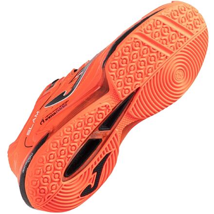 Nový Slam model značky JOMA na padel a tvrdé povrchy je určený pro pravidelné a náročné hráče. I nadále si zachovává maximální úroveň přilnavosti, ochrany, stability a odpružení. Svršek je vyrobený z prodyšné síťoviny, která má elegantní žakárovou úpravu s VTS perforací. Tato technologie umožňuje cirkulaci vzduchu a zajišťuje tak správnou ventilaci. Díky použitým technologiím SPORTECH a PROTECTION je bota lehká, flexibilní a odolná. Mezipodešev má nový tvar, i když stále obsahuje technologii DUAL REACTIVE, složenou z horního phylonu a spodního REACTIVE BALL. Dosahuje dokonalé rovnováhy mezi odpružením, reaktivitou a stabilitou, kterou posiluje díl STABILIS. Všestranná podešev z pryže DURABILITY, tvořená malými kruhovými výstupky pro zlepšení odolnosti na tvrdém povrchu. Usnadňuje skluzy během rychlé hry. Zahrnuje geometrickou strukturu ROTATION pro usnadnění otáčení.