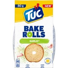 Slané krekry Tuc Bake Rolls – křupavé chlebové chipsy s intenzivní česnekovou příchutí UNIKÁTNÍ kulatý, tenký a extra křupavý chlebový snack Dvakrát pečený pro maximální křupavost Modernizovaná receptura …