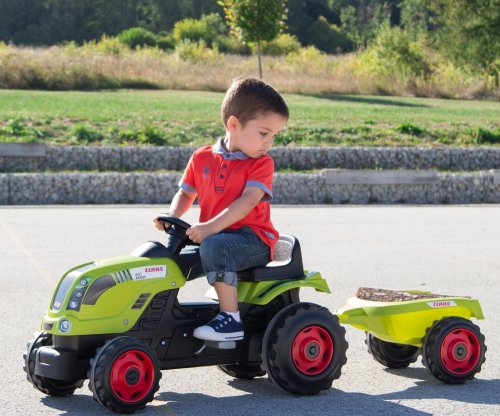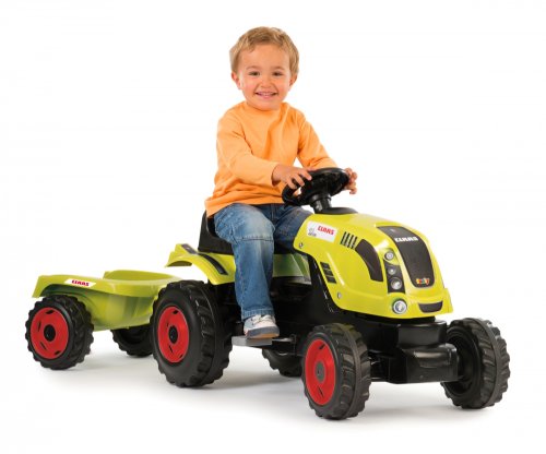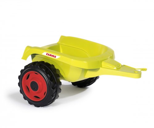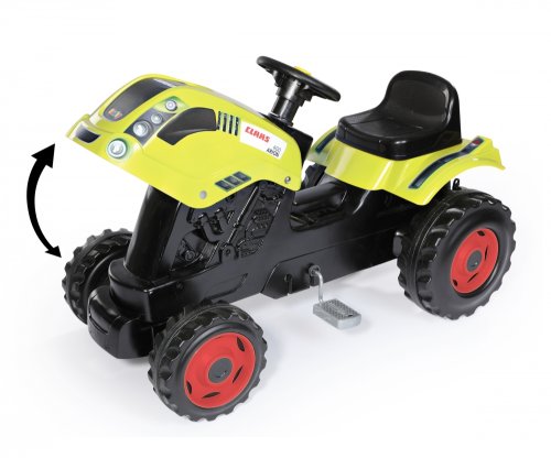 Šlapací traktor CLAAS s volantem a přívěsným vozíkem, který lze odpojit. Odklápěcí kryt motoru. Nastavitelné sedadlo dle výšky dítěte. Klakson na volantu. Vyrobeno z velmi kvalitního plastu. Rozměry vč. vozíku: 142 x 54,5 x 44 cm. Délka traktoru bez vozíku cca 80 cm. Hmotnost 6,3 kg.