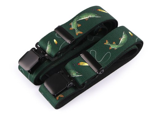 Kšandy s rybím potiskem potěší všechny rybáře. Kšandy bývají nedílnou a zároveň praktickou součástí jejich oblečení. Jsou kvalitní české výroby, elastický materiál umožňuje pohodlné nošení. Zadní vsadka z eko kůže jim dodává stylový vzhled. Ke kalhotám se upevňují na tři žabky - dvě vpředu a jednu vzadu.