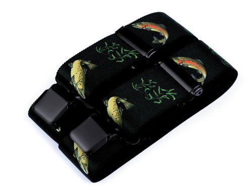 Kšandy s rybím potiskem potěší všechny rybáře. Kšandy bývají nedílnou a zároveň praktickou součástí jejich oblečení. Jsou kvalitní české výroby, elastický materiál umožňuje pohodlné nošení. Zadní vsadka z eko kůže jim dodává stylový vzhled. Ke kalhotám se upevňují na tři žabky - dvě vpředu a jednu vzadu.