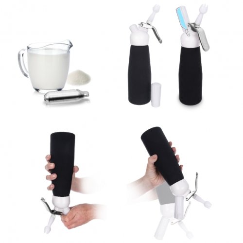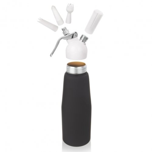 K přípravě šlehačky potřebujete buď výměnné nebo jednorázové šlehačkové bombičky s náplní N2O. Barva černo / bílá. Materiál hliník, plast ,silikonové těsnění. Objem celkový 0.68 litru, pojme 0.25 až 0.33 litru šlehačky. Průměr 8 cm, výška 30 cm. Nedoporučuje se používat přísady jako ztužovač šlehačky, krystalový cukr, který může způsobit hrudkování. EAN 8592381164294
