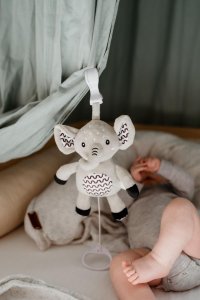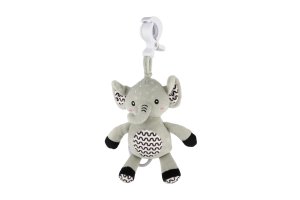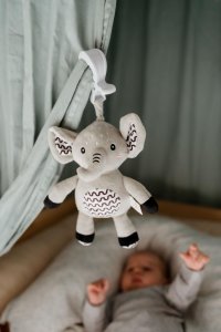 Roztomilý plyšový sloník s natahovacím hracím strojkem je ideální hračkou pro miminka již od narození. Po zatažení začne sloník přehrávat jemnou, uklidňující melodii, která pomáhá miminku se zklidnit a snadněji usnout. Díky praktickému závěsnému klipu můžete sloníka jednoduše připevnit na postýlku, kočárek, autosedačku nebo hrací hrazdičku. Miminko tak bude mít svého hebkého kamaráda stále u sebe – doma i na cestách. Sloník je vyroben z měkkého, příjemného plyše, který je vhodný už pro nejmenší děti. Kontrastní vzory na ouškách a bříšku podporují vizuální vnímání miminka. Hračka je certifikována v ČR, takže splňuje všechny bezpečnostní normy pro děti od 0 měsíců.