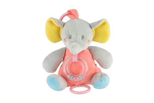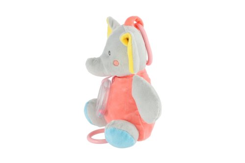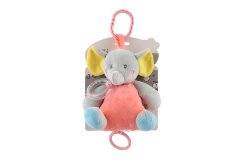 Natahovací plyšový slon hraje příjemnou melodii, která miminko uklidní a pomáhá mu při usínání. Hračku lze zavěsit za pomocí klipu na postýlku nebo kočárek. Hrací strojek je zabudovaný uvnitř zvířátka a plastové kolečko slouží jako natahovací klip. Rozměry balení 17 x 21,5 x 8 cm Vhodné pro děti od narození