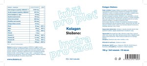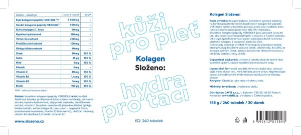 Vitamin B7 100 mcg (200 %) RHP - referenční hodnota příjmu (dříve doporučená denní dávka) Složení: Bioaktivní kolagenní peptidy VERISOL® (rybí, hovězí), želatinová tobolka, protispékavá látka: stearan hořečnatý, vinná réva extraxt, kyselina hyaluronová, bisglycinát zinečnatý, přeslička rolní extrakt, vitamín C (kyselina askorbová), jinan dvoulaločný extrakt, kuřecí kolagen II. typu, selen - organická forma produkovaná kvasinkami, vitamin B3 (niacinamid), uhličitan měďnatý, vitamin B2 (riboflavin), vitamin H (biotin). Upozornění: Není vhodné pro děti, těhotné a kojící ženy. Uchovávejte mimo dosah dětí. Není náhrada pestré stravy. Nepřekračujte doporučené dávkování. Může snižovat srážlivost krve (Ginkgo biloba).