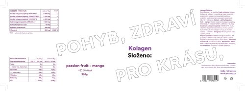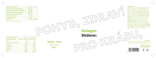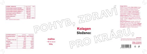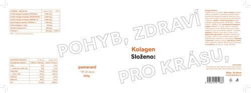 Vitamín C 800 mg (1000 % RHP) 800 mg (1000 % RHP) 800 mg (1000 % RHP) 800 mg (1000 % RHP) 800 mg (1000 % RHP) 800 mg (1000 % RHP) RHP - referenční hodnota příjmu (dříve doporučená denní dávka) Uvedené hodnoty jsou v sušině. Obsah sušiny min. 95 %. Složení: Pomeranč: Hovězí bioaktivní kolagenní peptidy (FORTIGEL®, TENDOFORTE®, VERISOL® B), rybí bioaktivní kolagenní peptidy VERISOL® F, inulin, vitamín C (kyselina l-askorbová), aroma pomeranč, kyselina hyaluronová, kuřecí kolagen II. typu, beta karoten, sladidlo - sukralóza. Malina: Hovězí bioaktivní kolagenní peptidy (FORTIGEL®, TENDOFORTE®, VERISOL® B), rybí bioaktivní kolagenní peptidy VERISOL® F, inulin, vitamín C (kyselina l-askorbová), aroma malina, kyselina hyaluronová, kuřecí kolagen II. typu, prášek červené řepy, sladidlo - sukralóza. Kiwi: Hovězí bioaktivní kolagenní peptidy (FORTIGEL®, TENDOFORTE®, VERISOL® B), rybí bioaktivní kolagenní peptidy VERISOL® F, inulin, vitamín C (kyselina l-askorbová), aroma kiwi, kyselina hyaluronová, kuřecí kolagen II. typu, beta karoten, brilantní modř FCF, sladidlo - sukralóza. Passion fruit-mango: Hovězí bioaktivní kolagenní peptidy (FORTIGEL®, TENDOFORTE®, VERISOL® B), rybí bioaktivní kolagenní peptidy VERISOL® F, inulin, vitamín C (kyselina l-askorbová), aroma passion fruit, aroma mango, kyselina hyaluronová, kuřecí kolagen II. typu, kurkumin, sladidlo - sukralóza. Lesní ovoce: Hovězí bioaktivní kolagenní peptidy (FORTIGEL®, TENDOFORTE®, VERISOL® B), rybí bioaktivní kolagenní peptidy VERISOL® F, inulin, vitamín C (kyselina l-askorbová), aroma, barvivo - sušený extrakt z hroznových slupek, kyselina hyaluronová, kuřecí kolagen II. typu, kurkumin, sladidlo - sukralóza.Citron-limetka: Hovězí bioaktivní kolagenní peptidy (FORTIGEL®, TENDOFORTE ®, VERISOL® B), rybí bioaktivní kolagenní peptidy VERISOL® F, inulin, vitamin C (kyselina l-askorbová), aroma, kyselina hyaluronová, kuřecí kolagen II. typu, kurkumin, sladidlo – sukralóza. Alergeny: Alergeny: obsahuje ryby nebo výrobky z nich Upozornění: Dopněk stravy se sladidly. Není vhodné pro děti, těhotné a kojící ženy. Uchovávejte mimo dosah dětí. Není náhrada pestré stravy. Nepřekračujte doporučené dávkování.