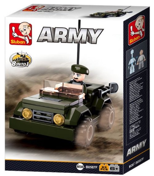 Ministavebnice vojenské techniky ze série Army 8into1, jejíž kompletací vznikne možnost sestavit velký ucelený model tanku, či obrněného vozidla. Inovativní stavebnice Sluban je možno kombinovat s podobnými stavebnicemi mnoha dalších významných výrobců. Jsou vyráběny z kvalitního, nezávadného a odolného ABS plastu. Každá stavebnice je opatřena návodem k sestavení a balena v pestře potištěné papírové krabičce. Hlavní vlastnosti:82 dílků, 1 figurkastřední obtížnostkompletací série lze sestavit velký modelinovativní figurky s otáčivými i výkyvnými částmi tělkompatibilní se stavebnicemi dalších výrobců