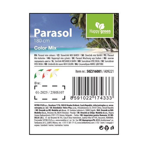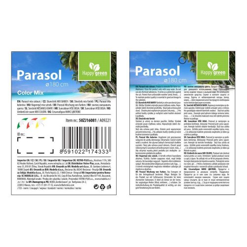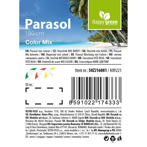 Slunečník má kovovou konstrukci, potahová látka je z polyesteru. Slunečník je vysoký 190 cm, průměr tyče 2,2 cm a je dodáván v mixu barev a dekorů.