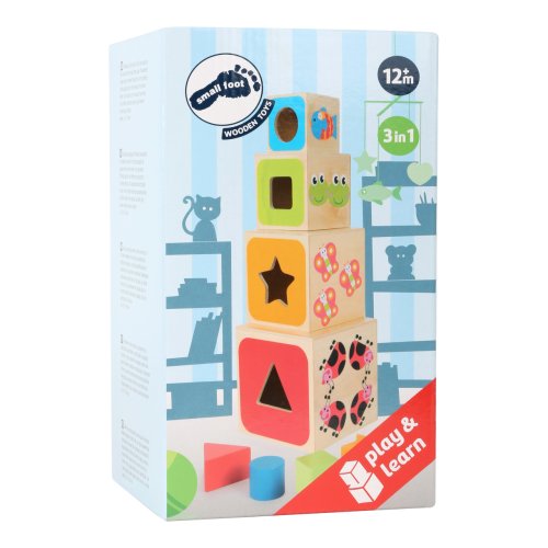 Dřevěné vkládací kostky učí děti geometrickým tvarům, barvám, číslům i písmenům. Geometrické tvary musí být vloženy přes správné otvory. Vytištěná písmena na kostkách musí být naskládána ve správném pořadí, což nabízí optimální výukový nástroj. Upevňuje jemnou motoriku dítěte. Roztomilé motivy zvířátek děti zaujmou a učení pro ně bude velkou zábavou. Hlavní vlastnosti: obsahuje 4 vkládací kostkyučí děti geometrickým tvarům, barvám, číslům a písmenůmprocvičuje jemnou motoriku dětí