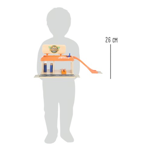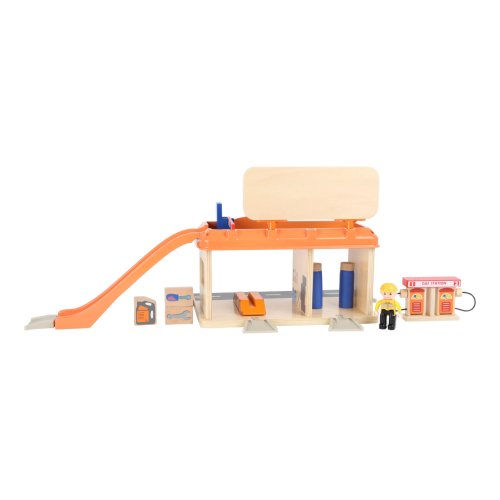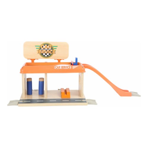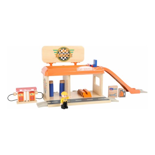 Služby na nejvyšší úrovni! Při pohledu na vybavení autoservisu zaplesá srdíčko každého malého fanouška motorů, jeho součástí je totiž krom autodílny vybavené plošinou a nezbytným příslušenstvím také čerpací stanice s magnetickými pistolemi, nebo myčka. Díky nájezdové rampě mohou zákazníci využít služeb parkoviště na střeše servisu, opatřeného bezpečnostní závorou. Co víc, k plné spokojenosti je zde k dispozici i pohyblivá figurka profesionální obsluhy a vždy připravené vozidlo taxislužby! Díky kombinaci silné překližky a robustních plastových dílů může hračka nabídnout vysokou odolnost a životnost. Lze ji rozšířit množstvím příslušenství a je také plně kompatibilní s vláčkodráhami jiných velkých výrobců. Hlavní vlastnosti:autoservis a čerpací stanice, 3 díly herních doplňků, autíčko a 1 figurka2 podlaží, rampa a parkoviště opatřené závorourobustní a odolné provedeníkompatibilní i s vláčkodráhami dalších výrobců