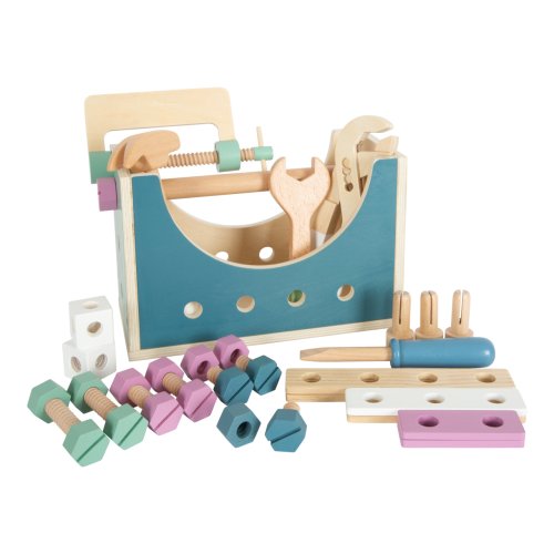 Praktická sada nářadí v bedýnce s rukojetí. Hračka 2v1, když bedýnku otočíte, můžete ji použít jako pracovní desku! Díky této vychytávce dětem hračka nabídne nekonečné možnosti hraní, mohou si hrát i na cestách. Neokázalé skandinávské barevné schéma s jasně viditelným dřevem. V balení najdete 5 ks nářadí – kladivo, klíč, šroubovák, hasák, svěrák. Rukojeť můžete odstranit za pomocí nářadí, nářadí můžete do bedýnky jednoduše uložit díky jejím otvorům. Genderově neutrální design v jemných pastelových barvách. Skvěle se hodí k ostatním produktům z řady Nordic. Hlavní vlastnosti: dřevěná motorická hračkagenderově neutrální designproduktová řada Nordic