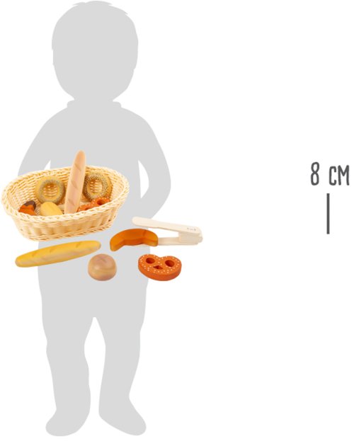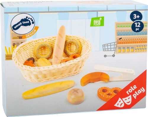 Croissanty, bagely, preclíky, žitný i pšeničný rohlík, houska a dalamánek jsou nutným sortimentem Vašeho malého obchůdku. Dřevěné pečivo můžete nabídnout jako přílohu při vaření v dětské kuchyňce. Hlavní vlastnosti: 10 ks pečiva, pletená ošatka a kleštěpodporuje hraní rolí a motorické dovednosti
