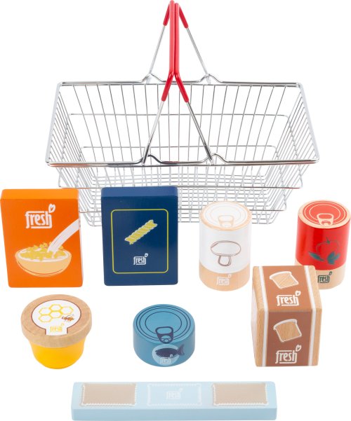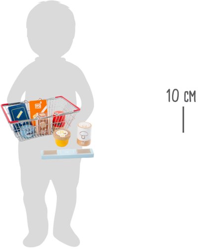 Je čas nakoupit potraviny do spíže! Sada obsahuje vícezrnný chléb, kukuřičné lupínky, těstoviny, konzervu tuňáka, rajčatovou omáčku a houby v plechovce, sušenky a sklenici medu. A vše ze dřeva! S kvalitním kovovým nákupním košíkem je nákup v obchodě rychle hotový! Hlavní vlastnosti: sada obsahuje 9 dílůpodporuje hraní rolí odolný materiál zaručuje dlouhotrvající hru