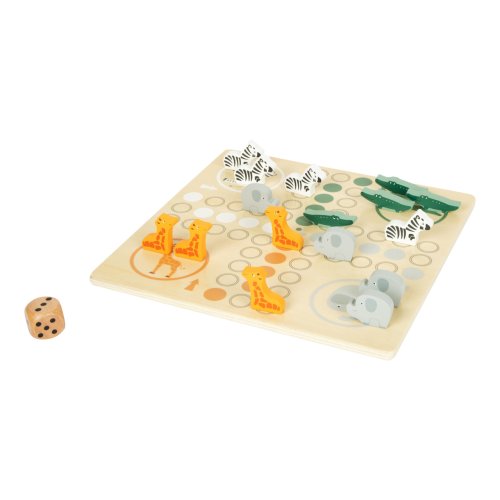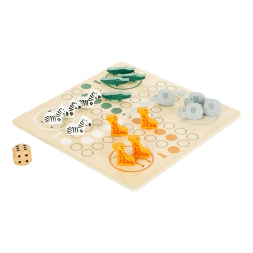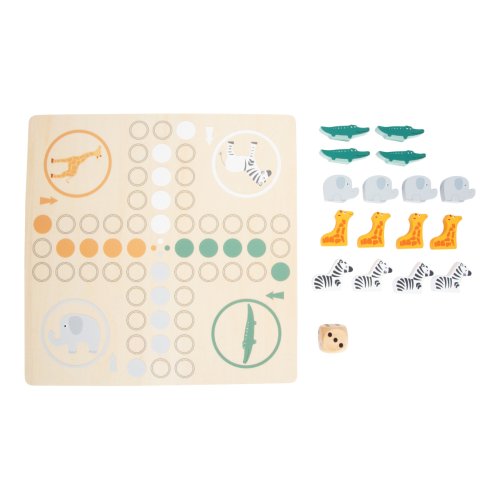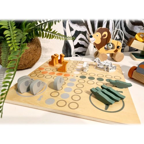 Safari přímo u vás doma. Toto dřevěné Člověče má figurky zebry, slona, žirafy a krokodýla. Cílem je dostat všechny figurky do domečku. Extra velká kostka vám ukáže, o kolik polí se můžete posunout. Klasická stolní hra v trendy designu, která děti naučí počítat, poznávat barvy a zvířata. Děti se také naučí prohrávat. Hlavní vlastnosti: vhodné pro 2-4 hráčeherní deska, 16 figurek zvířátek a kostkapestrobarevné provedení