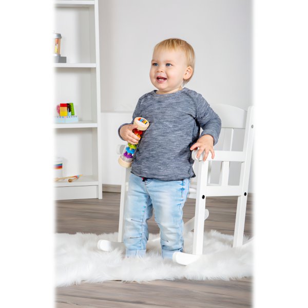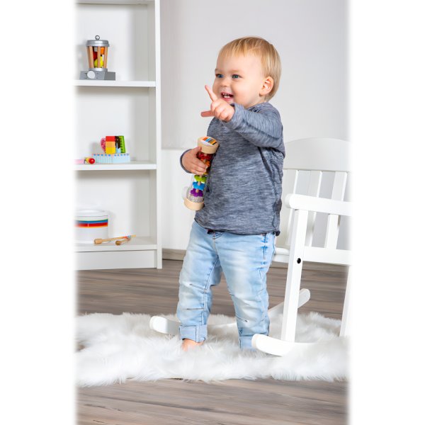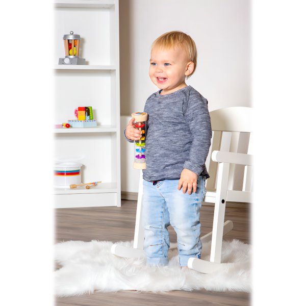 Tak přesně takhle zní déšť! S dešťovou holí můžete imitovat zvuky jemného deště. Můžete ji použít jako chrastítko, rytmickou hračku. Tělo hračky je průhledné, můžete tak pozorovat jak se kuličky pohybují přes zábrany ve tvaru květin. Hlavní vlastnosti: hračka trénuje akustické a vizuální vnímánívhodná také jako chastítko pro nemluvňatauklidňuje smysly dětí i dospělých