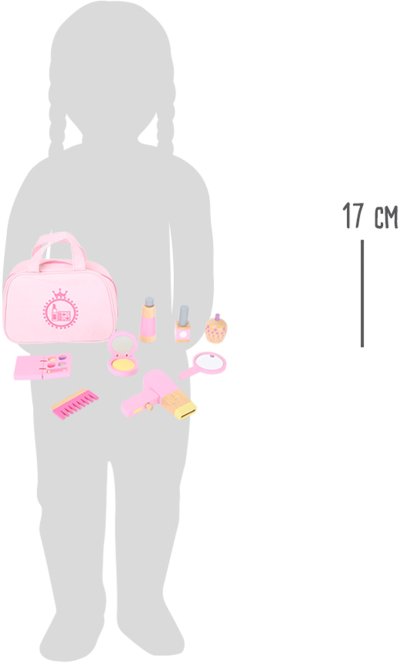 Zrcadlo, zrcadlo, kdo je nejkrásnější… v tomto dětském pokoji? Soutěž krásy může začít s touto roztomilou kosmetickou taštičkou plnou růžových dřevěných doplňků. Fén, hřeben, lak na nehty i voňavka, pudr i oční stíny jsou tím, co by mladá parádnice měla mít. Lahvičky z lakovaného dřeva se úhledně vejdou do přenosné tašky. Hlavní vlastnosti: obsahuje taštičku a 8 ks příslušenstvírozvíjí hraní rolí