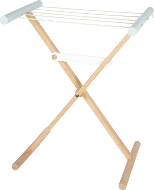 Na tomto dřevěném sušáku na prádlo je snadné usušit veškeré oblečení pro panenky, medvídky a jejich kamarády. Tento sušák prádla, který se snadno sestavuje, obsahuje pět bavlněných šňůr ve výšce vhodné pro děti. Je ideální hračkou na hraní rolí, která napodobuje rodiče při jejich domácích pracích a zábavnou formou přivádí děti k nadšení pro každodenní úkoly. Dodává se s bezpečnostní tyčí pro stabilní postavení. Je to skvělý doplněk do každého dětského pokoje, který působí vizuálně skvělým dojmem díky množství přírodního dřevěného materiálu a jemné barvě přírodního dřeva. Prádlo je suché! Po dokončení hry lze sušák na prádlo snadno složit a uložit tak, aby šetřil místo. Hlavní vlastnosti: 5 ks textilních šňůrbezpečnostní tyč pro stabilní postavenípodporuje kreativitu