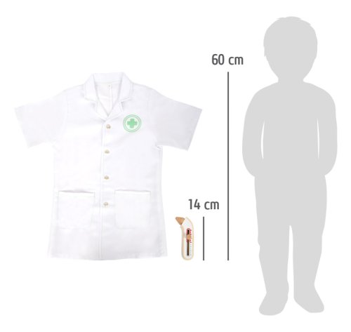 Kompletní hrací sada s lékařským plášťem a zdravotnickým vybavením. Najdete zde injekční stříkačku, stetoskop a teploměr z robustního dřeva. Píst stříkačky se po stlačení zatáhne. Teploměr má nastavitelný ukazatel teploty. Lékařský plášť má dvě praktické kapsy, zapíná se na patentky, takže si jej mohou mladí medici rychle obléct i svléct. Ideální hračka pro hraní na role nebo jako kostým na karneval. Vhodné pro děti, které jsou vysoké 105-110 cm (vel. 110). Ideální doplněk k doktorské brašně a dalším podobným produktům. Hlavní vlastnosti: lékařský plášť a další doplňkypro děti vysoké 105-110 cmperfektní pro hraní na role nebo na karneval
