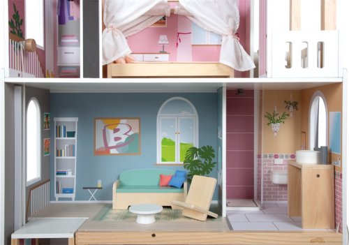 Dollhouse Dream Villa XL je skutečný dům snů, do kterého se děti zamilují na první pohled. Tento elegantní domeček nabízí útulný domov pro všechny módní panenky do 30 cm a je plně vybavený, takže si s ním lze hrát ihned po vybalení. Tři prostorná patra, otevřená přední část a moderní dřevěný vzhled vytvářejí realistické prostředí, kde může naplno rozkvést dětská fantazie i tvořivost. Domeček zaujme svým světlým vzhledem, decentním barevným laděním a detaily z masivního dřeva. Ilustrace na stěnách dodávají každému pokoji živý a moderní vzhled. Centrem vily je funkční výtah, který pomocí otočného pohybu přepravuje panenky mezi patry. V podkroví se nachází šatna s věšákem, pěti ramínky a romantickou postelí s nebesy, ideální pro převlékání a módní hraní. Koupelna zaujme realistickými doplňky, jako je akrylátová sprchová zástěna, závěsná toaleta s otevíracím víkem a moderní umyvadlo umístěné na skříňce. Ve druhém patře nechybí obývací pokoj s pohovkou, dvěma křesly a stolkem, který přímo vybízí k odpočinku nebo setkání s přáteli na balkoně. Promyšlený kuchyňský ostrůvek se zásuvkami a zvonkem, který oznamuje návštěvu, dotváří realistickou atmosféru každodenního života.Díky otevřené přední části je Dollhouse Dream Villa XL ideální i pro společnou hru více dětí. Mohou domeček zařizovat, přestavovat a vymýšlet si nekonečné příběhy, které se mění s každým dnem. Tento nádherný domeček pro panenky není jen krásnou hračkou, ale také prostředkem, který podporuje dětskou kreativitu, rozvíjí motorické dovednosti, řeč i sociální schopnosti. Vila snů tak nabízí nejen hodiny zábavy, ale i prostor, kde může každé dítě naplno projevit svou fantazii a tvořivost. Hlavní vlastnosti: dostatečně velký pro společnou hru více dětífunkční zvonek a prvky nábytkuvhodný pro panenky do velikosti 30 cmvhodný do jakéhokoliv interiéruobsahuje spousty kusů doplňků a nábytkupodporuje rozvoj jemné motoriky a fantaziese 3 patry a balkonemvčetně výtahu - lze ovládat otočnou klikousoučástí je šatna včetně zrcadla, věšák a 5 ramínek na oblečení, postel s nebesy a závěsykoupelna s akrylátovou sprchovou stěnou, toaletou s výklopným sedátkem a umyvadlem na deskumoderní design, viditelné dřevěné materiály a otevřená přední část pro optimální hratelnost s více dětmi
