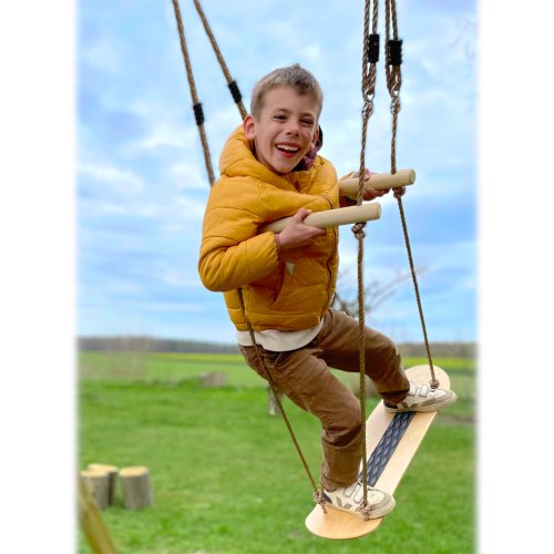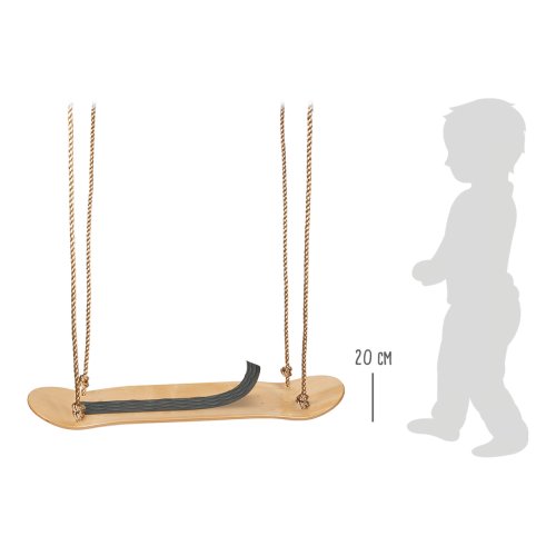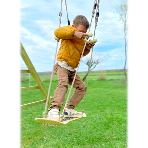 Houpejte se jako šampioni v netradičních sportech, na prkně připomínajícím skateboard! Děti na něm mohou nejen sedět, ale i stát jako na skutečném skateboardu! K ruce je jim přitom dvojice madel, jejichž výšku lze na laně snadno upravit. Součástí balení je také protiskluzová samolepka pro ještě větší jistotu při houpání ve stoje. Prkno je vyrobeno ze silné překližky a spolu s robustními madly z masivního dřeva je zavěšeno na vysoce odolných a poddajných nylonových lanech. Délku lan lze kdykoli snadno upravit pomocí kovových průvleků, na koncích jsou opatřena kovovými kroužky a bezpečnostními karabinami k zavěšení. Hlavní vlastnosti: madla a protiskluzová samolepka pro větší bezpečnostjednoduché nastavení délky lan a polohy madelnosnost 100 kgodolné provedení