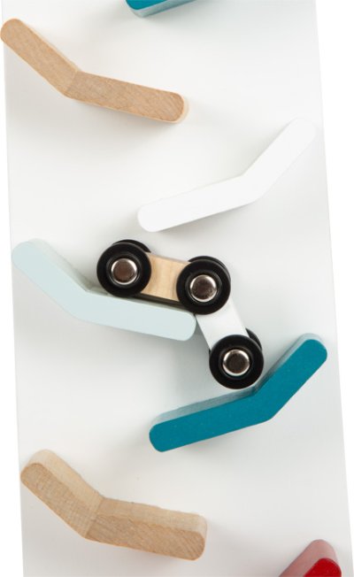 Tato kaskádová věž přitahuje pohledy každého! Při vypuštění pestrobarevných autíček shora se začnou řítit po různých úrovních dráhy. Vydávají zábavné klapavé zvuky a na závěr se rozjedou po podlaze. Je to uklidňující a zároveň fascinující dřevěná hračka! Díky moderním barvám v kombinaci s bílou a přírodním dřevem je sada také skvělou dekorací! Hlavní vlastnosti: věž a 2 autíčkapři jízdě dolů vozidlo dělá saltarozvíjí soustředěnost a jemnou motoriku