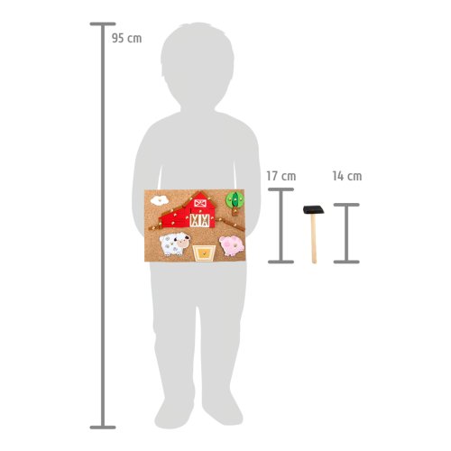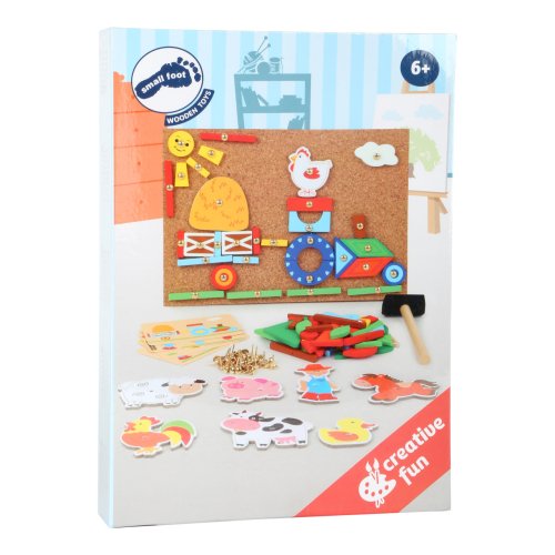 Tvůrčí zábava nikdy nekončí! S tímto kladívkem, dílky a korkovou deskou můžete vytvořit mnoho podob farmy. Čtyři vzorové karty navrhují motivy obrazu. Sada je balena v boxu a snadno se přepravuje. Hlavní vlastnosti: podporuje kreativitu a koncentracipodporuje jemnou motorikupraktický úložný box