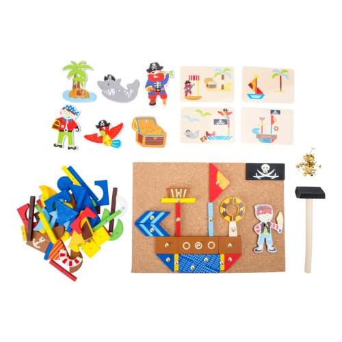 Klasická zatloukací hra s bohatým výběrem malých dřevěných dílků s motivem pirátů, včetně praktického dřevěného kladiva. Součástí jsou čtyři oboustranně potištěné karty s návrhy motivů. Dodává se se zlatými připínáčky, které lze snadno připevnit do pružného korku. Umožňuje vytvářet jedinečné tepané obrazy. Díky praktickému úložnému boxu se nic neztratí. Hlavní vlastnosti: podporuje kreativitu a koncentracipodporuje jemnou motorikupraktický úložný box