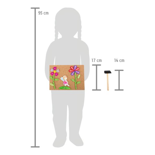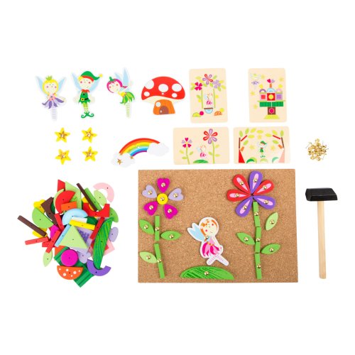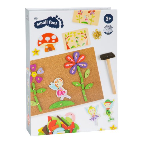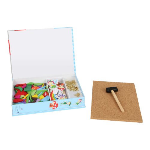 S touto hrou si může každé dítě vyrobit svůj vlastní nástěnný obrázek s motivem víl. Dřevěné a kartonové dílky skládačky mají předvrtané otvory, malé hřebíčky lze snadno zatlouct do korkové desky dřevěným kladívkem. Balení obsahuje také čtyři oboustranně potištěné karty s návrhy motivů. Hlavní vlastnosti: podporuje kreativitu a koncentracipodporuje jemnou motorikupraktický úložný box