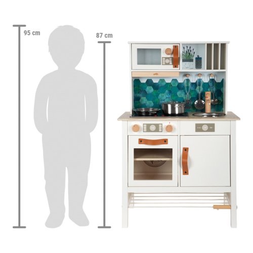 Video je pouze ilustrační. Moderní dětská kuchyňka s robustní konstrukcí v trendy bílé barvě v kombinaci se stylovými koženými madly v koňakové barvě. Okamžitě připravena k hraní s přiloženým hrncem s poklicí, pánví a kovovým kuchyňským náčiním. Dodává se s kovovým dřezem a otočnými knoflíky, které vydávají zvuk. Součástí je elektronická varná deska se světlem a zvukem a zatahovací digestoří se světelným symbolem. Vyjímatelný pekáč lze použít také jako tabuli na kreslení. Povrchy v chladničce a troubě jsou potištěné kuchyňskými detaily pro větší zábavu při hraní. Oboustranný zadní panel s vysoce kvalitním potiskem ve vzhledu dlaždic nebo jednoduché bílé barvě. Lze perfektně doplnit dalšími výrobky a kuchyňskými spotřebiči z kolekce Tasty. Hlavní vlastnosti: kovové doplňky a příslušenstvífunční prvky jako cvakající knoflíky, varná deska s efektem světla a zvukunový moderní designnapájení - 2xAA baterie (nejsou sočástí balení)možné doplnit produkty z kolekce Tasty