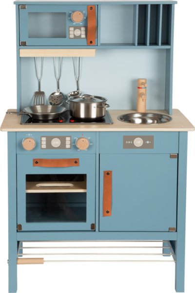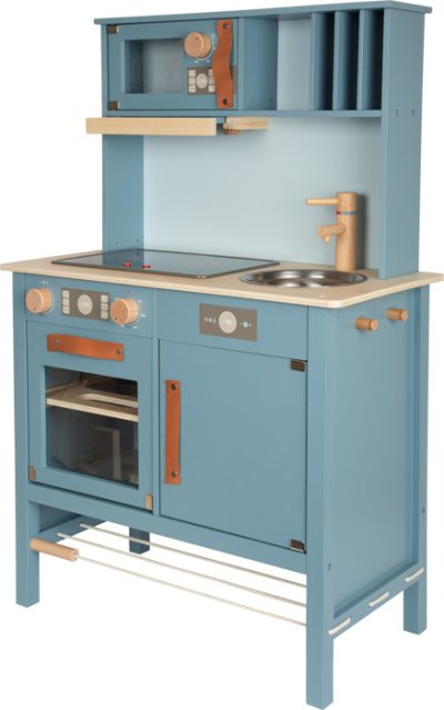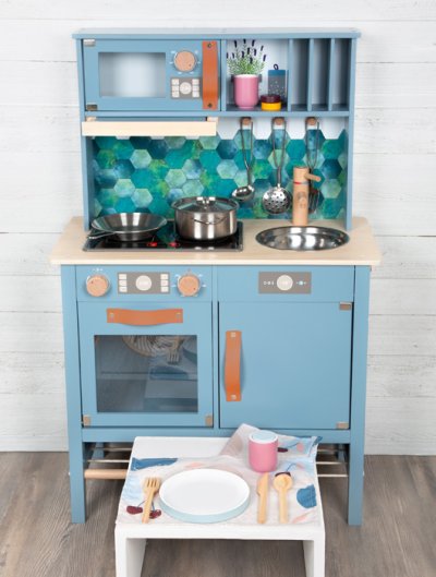 Moderní dětská kuchyňka s robustní konstrukcí v trendy kouřově modré barvě, v kombinaci se stylovými koženými madly v koňakové barvě. Okamžitě připravena k hraní s přiloženým hrncem s poklicí, pánví a kovovým kuchyňským náčiním. Dodává se s kovovým dřezem a otočnými knoflíky, které vydávají zvuk. Součástí je elektronická varná deska se světlem/zvukem a zatahovací digestoří se světelným symbolem. 2v1, vyjímatelný pekáč lze použít také jako tabuli. Povrchy v chladničce a troubě jsou potištěné kuchyňskými detaily pro větší zábavu při hraní. Oboustranný zadní panel s vysoce kvalitním potiskem ve vzhledu dlaždic nebo jednoduché modré barvě. Lze perfektně doplnit dalšími výrobky a kuchyňskými spotřebiči z kolekce Tasty. Hlavní vlastnosti: kovové doplňky a příslušenstvífunční prvky jako cvakající knoflíky, varná deska s efektem světla a zvukunový moderní designnapájení - 2xAA baterie (nejsou součástí balení)možné doplnit produkty z kolekce Tasty