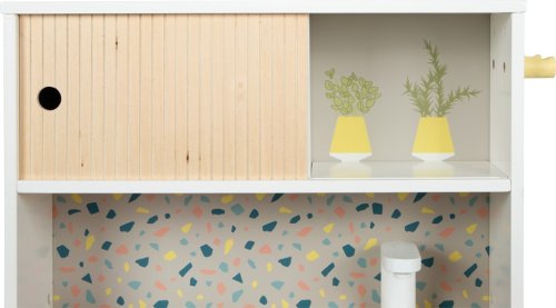 Tato moderní bílá kuchyňka v jemném skandinávském stylu s barevným vzorem inspirovaným terazzem je ideálním vstupem do světa kreativní hry na vaření. Kuchyňka je praktická a skladná a nabízí vše, co malí kuchaři potřebují – sporák s otočnými knoflíky, troubu s magnetickými dvířky, kovový dřez s kohoutkem a také pánev, hrnec s pokličkou a dřevěnou vařečku. Stylová kombinace bílé barvy, přírodního dřeva a hravého vzoru na zadní stěně dělá z kuchyňky krásný doplněk dětského pokoje. Pracovní plocha ve výšce přibližně 22 cm je ideální pro malé dětské ručičky, ale také jako „kuchyňka pro panenky“ – skvělá pro hraní s velkými panenkami (cca 43 cm).Kompaktní konstrukce šetří místo, takže se kuchyňka hodí i do menších bytů nebo jako druhá kuchyňka u prarodičů. Děti si při hře osvojují používání kuchyňského náčiní, rozvíjejí fantazii, jemnou motoriku i sociální dovednosti při společném vaření. Hlavní vlastnosti: kuchyňka, hrnec s pokličkou, pánev, dřevěná vařečkavyjímatelný kovový dřez, dvířka trouby s magnetickým zavíránímrozmanité úložné prostory a odkládací plochy otočné knoflíky s cvakavým zvukem pro realistický zážitek z kuchyně díky pracovní výšce 22 cm si s ní lze hrát i jako s "kuchyní pro panenky" s většími panenkami (cca 43 cm). podporuje hraní rolí a kreativitu a rozvíjí sociální dovednosti