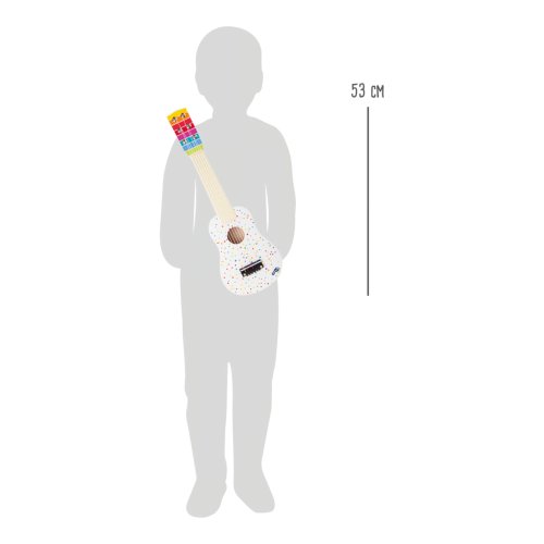 Tato kytara v bílé barvě s malými barevnými puntíky je nutnou výbavou pro všechny mladé milovníky hudby. Kytara je také nezbytnou součástí dětské kapely či herny. Může sloužit k naučení prvních akordů a citu pro rytmus. S pomocí malé kytary se mohou děti naučit doprovázet první říkanky a popěvky. Hlavní popis: děti se naučí akordy a hudební sluch
