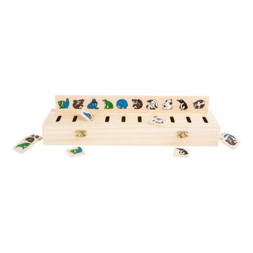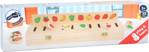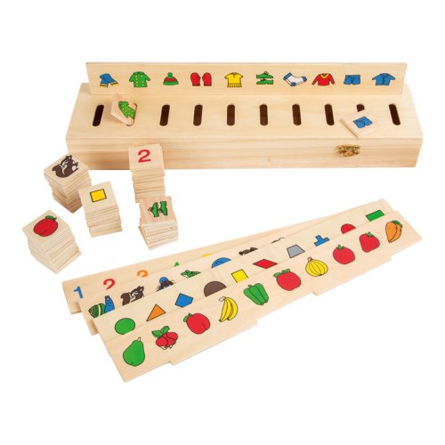Tato pěkná krabička má 5 zásuvných desek a 50 čtverečků se symboly. Je to dřevěná vkládací hra, která trénuje rozeznávání barev a různých předmětů – oblečení, zvířata, ovoce. Najdete zde ale také geometrické tvary a číslice. Čtvercový dílek s motivem spárujte a poté vhoďte do správného otvoru. Všechny dílky mohou být uloženy do vkládačky, víko je bezpečně uzavíratelné pomocí 2 západek. Hlavní vlastnosti: hra pomáhá s rozpoznáváním tvarů a barevrozvíjí řeč dětívelmi oblíbená hra