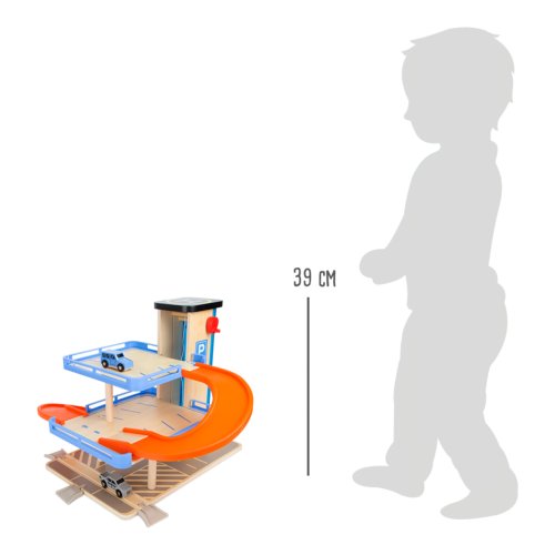 Prostorná garáž v atraktivních barvách nabízí tři podlaží propojená výtahem a na sebe plynule navazujícími rampami. Součástí balení je dvojice autíček, a děti si tak mohou hrát bezprostředně po sestavení. Základní díly ze silné překližky a masivního dřeva doplňují robustní plastové prvky, hračka je proto zvláště odolná a nabízí dlouhou životnost. Lze ji rozšířit množstvím příslušenství a je také plně kompatibilní s vláčkodráhami jiných velkých výrobců. Výrobek vyžaduje montáž, dodáváno s obrázkovým návodem k sestavení. Hlavní vlastnosti:garáž a 2 autíčka3 podlaží, 2 rampy a funkční výtahrobustní a odolné provedeníkompatibilní i s vláčkodráhami dalších výrobců