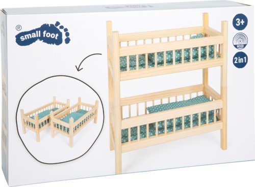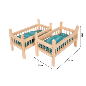 Čas na spaní pro panenky a plyšové kamarády!Tato patrová postel pro panenky z odolného přírodního dřeva nabízí dvojnásobný prostor pro spánek. Lze ji použít jako patrovou postel, nebo ji snadno rozdělit na dvě samostatná lůžka. Díky zaobleným hranám, kvalitnímu zpracování a velikosti vhodné pro panenky a plyšové hračky do 39 cm je ideální volbou pro malé rodiče. Součástí je i pohodlné ložní prádlo – velké deky, polštáře a prostěradla, které zajistí panenkám útulné místo pro odpočinek. Tato variabilní postýlka se snadno přizpůsobí každé hře. Jako patrová postel přináší zábavu na dvou úrovních, jako dvě samostatné postele umožňuje hru s více panenkami najednou. Přirozený vzhled a jednoduchý design z ní dělají stylový a nadčasový doplněk do dětského pokoje. Hraní na uspávání a péči o panenky podporuje rozvoj empatie, sociálních dovedností i porozumění každodenním situacím, děti tak přirozeně napodobují svět dospělých. Hlavní vlastnosti: postel pro panenky 2 v 1 lze používat jako dvě samostatné postele nebo složit jako patrovou postel vyrobena z pevného přírodního dřeva zaoblené hrany pro bezpečné používání dětmi včetně ložního prádla - 2 extra velké přikrývky, 2 polštáře a 2 prostěradla vhodná pro panenky a plyšové hračky do velikosti 39 cm podporuje sociální a kreativní hraní rolí ideální doplněk k nábytku pro panenky