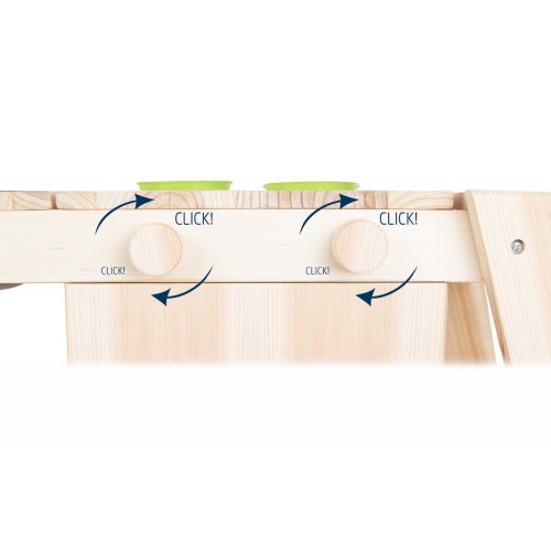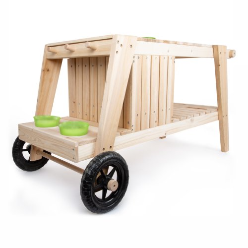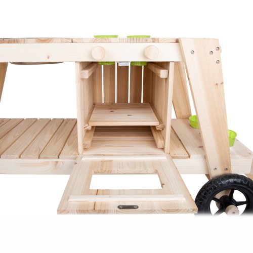 Kdo chce raději vařit venku, na sluníčku a čerstvém vzduchu? Tomu příjde vhod kuchyňka, která svou barevností zapadne do přírody. Je opatřená velkými kolečky a s pomocí dospělého ji lze přemisťovat i v nerovném terénu. Nabízí pevnou a odolnou konstrukci z neošetřeného přírodního dřeva, které pobízí, abyste si ji hravě nalakovali dle vlastní fantazie. Její prostorná pracovní plocha je přístupná ze všech stran a lze ji snadno využít k mnoha různým činnostem. Kuchyňka nabízí troubu opatřenou dvířky s magnetickým zavíráním a dvojicí knoflíků, které otáčením vydávají cvakavé zvuky, pečení jako opravdové! Uvnitř trouby naleznete praktickou dřevěnou desku, kterou lze využít dle potřeb, nejen jako pečící plech. Objemné úložné prostory mohou sloužit k uskladnění kuchyňského, ale i zahradního nářadí. K tomu je kuchyňka vybavena množstvím odkládacích otvorů a závěsů pro další, nejrůznější náčiní. Součástí kuchyňky je větší mísa, menší misky a květináče, vše vyrobené z odolného kovu. Vyrazíte k záhonu, pískovišti, nebo připravit svačinu u bazénu? Výrobek vyžaduje montáž, dodáváno s obrázkovým návodem k sestavení. Hlavní vlastnosti:polní kuchyňka, 2 květináče, 1 větší mísa, 2 menší misky a pracovní deskatrouba s dvířky a otočnými knoflíky poskytujícími zvukovou odezvuobjemné úložné prostory, odkládací otvory a háčkyopatřeno kolečky, snadno přemístitelnémultifunkční, rozmanité využitíneošetřené dřevo vhodné k osobitým úpravám a lakování