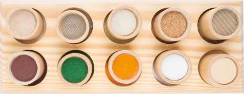 Rozpoznejte barvy, použijte také hmat při rozeznávání různých textur. S touto smyslovou hrou se zabaví i kojenci, procvičí si svůj hmat. Cílem hry je seřadit nádobky hmatem podle podobného svrchního materiálu. Hra bude zábavná i pro nejmenší děti, zároveň si procvičí motoriku a soustředění. Hlavní vlastnosti: dřevěná hmatová hračkatrénuje motoriku a soustředění dětíneobvyklé pexeso