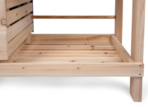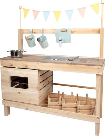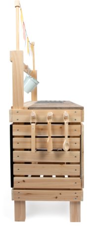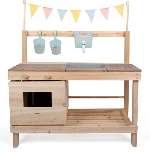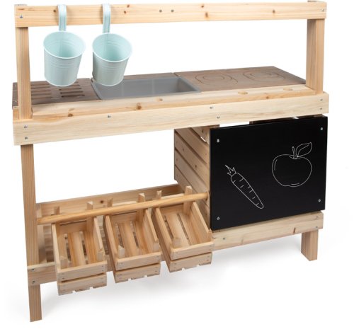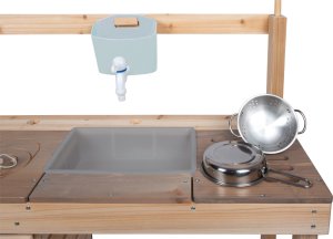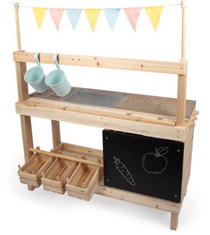 Tato vysoce kvalitní, extra velká venkovní dětská kuchyňka se stánkem z masivního dřeva nabízí jedinečný zážitek z hraní venku. Je přístupná z obou stran a vybavená množstvím doplňků – z jedné strany slouží jako kuchyňka pro vaření, míchání a experimentování s vodou či hlínou, z druhé strany jako obchod nebo dílna, která podporuje kreativní hraní na nakupování a prodej. Mezi hlavní prvky patří trouba s otočnými knoflíky a výsuvným plechem, varná deska s gravírovanými symboly a designem dotykového ovládání a dřez s dávkovačem vody a kohoutkem. Nechybí ani grilovací plocha, tři dřevěné bedýnky, závěsné květináče, police, kovové nádobí, kuchyňské doplňky a také dekorativní vlaječka, která dodává celé kuchyňce jedinečný vzhled. Součástí je i křídová tabule, boční háčky, dostatek úložného prostoru a kontrastní pracovní deska. Praktické otvory na ukládání herního náčiní pomáhají udržet pořádek. Tato multifunkční venkovní kuchyňka a obchod zaujme nejen svým propracovaným designem a vodními prvky, ale i kvalitním zpracováním. Ať už ji děti využijí jako kuchyňku, dílnu nebo obchůdek, přirozeně rozvíjí jejich motoriku, jazykové dovednosti i sociální schopnosti při hraní rolí a poskytuje hodiny zábavy. Pro zachování dlouhé životnosti doporučujeme neošetřené dřevo pravidelně ošetřit ochranným nátěrem. Hlavní vlastnosti: velká venkovní kuchyňka a prodejní stánek v jednom provedenívyrobeno z robustního masivního dřeva pro maximální stabilitupracovní plocha s odolným nátěrem proti povětrnostním vlivům v kontrastních barváchplně vybavená herní zóna s varnou deskou, troubou, grilem, dřezem a dávkovačem vodybohaté příslušenství zahrnuje plech na pečení, závěsné květináče, dřevěné boxy a křídovu tabulioboustranný design s velkorysým úložným prostorem, policemi a výklenky na hračkystylový vzhled doplněný o dekorativní řetěz s vlaječkamisoučástí balení je i komplexní sada kovového nádobí a kuchyňského náčiní