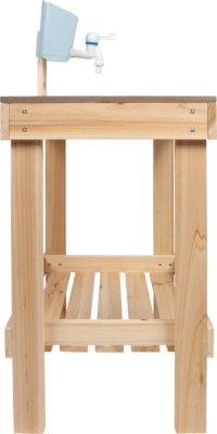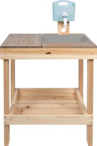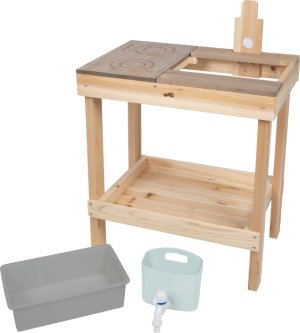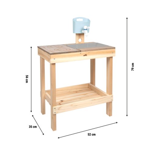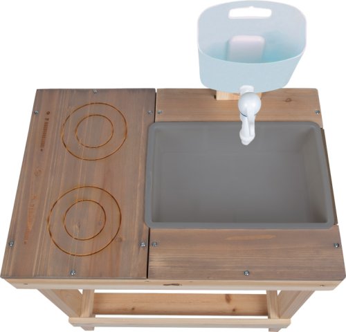 Tato venkovní dětská kuchyňka z pevného masivního dřeva vyniká odolnou konstrukcí a stylovým designem. Pracovní plocha je šedě lakovaná, odolná vůči povětrnostním vlivům a doplněná o varnou desku s vyrytým označením „dotykové ovládání“. Součástí je také odnímatelný zásobník na vodu s kohoutkem, stabilní plastový dřez a nabízí dostatek úložného prostoru v prostorné spodní polici. Praktické otvory pro odkládání hraček a nádobí navíc pomáhají udržet pořádek. Kuchyňka je ideální do menších zahrad, na terasy nebo balkony – je odolná, stylová a zároveň funkční. Lze ji navíc využít i jako herní stolek pro děti. Díky kompaktním rozměrům a promyšleným detailům je tato kvalitní kuchyňka z masivního dřeva skvělým doplňkem každého venkovního herního prostoru. Děti si mohou vařit podle vlastní fantazie, hrát si s vodou i hlínou a rozvíjet své kreativní nápady. Neutrální barevné provedení a odolná pracovní plocha se snadno sladí s každým zahradním prostředím. Jako venkovní kuchyňka nabízí pestrou a smysluplnou zábavu. Pro zajištění dlouhé životnosti doporučujeme neošetřené dřevo pravidelně ošetřit ochranným nátěrem. Výrobek je dodáván v rozloženém stavu s přehledným obrázkovým návodem k sestavení. Hlavní vlastnosti: venkovní dětská kuchyňka a herní stolek z masivního dřeva s gravírovanou varnou deskou v designu dotykového ovládání plastový dřez a odnímatelný zásobník na vodu s kohoutkem pracovní deska ošetřená barvou odolnou vůči povětrnostním vlivům prostorná spodní police pro uložení hraček, nádobí a příslušenství ideální na zahradu, terasu i balkon stabilní konstrukce a moderní vzhledrozvíjí komunikační a sociální dovednosti dětíideální pro hru na role a hravé učenídodáváno s obrázkovým návodem k montáži