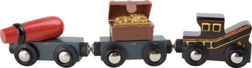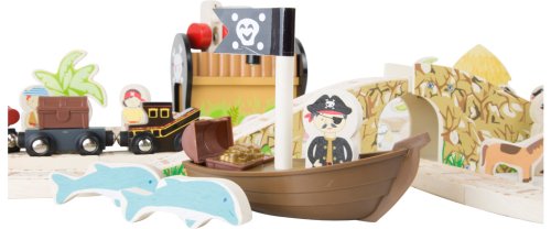 Šest pirátů zde vládne vlastní dřevěné železnici na svém ostrově. Dřevěné kolejnice jsou dokonce opatřeny můstkem a zvonkem. Dřevěný vláček převáží dělo a truhlu s pokladem plnou zlata. Jeřábová stanice je vybavena magnetem, který lze spustit dolů pomocí otočného zařízení. Všechna zvířata a další doplňky jsou vyrobeny z odolného dřeva nebo plastu a úžasně završují tento skvělý hrací ostrov. Kompatibilní se všemi druhy klasických vláčkodráh. Součásti balení je vše dle obrázku. Hlavní vlastnosti: vyrobeno z kvalitních a zodpovědně získaných přírodních materiálůodpovídá současným evropským bezpečnostním normámpodporuje představivost, obratnost a koordinaci