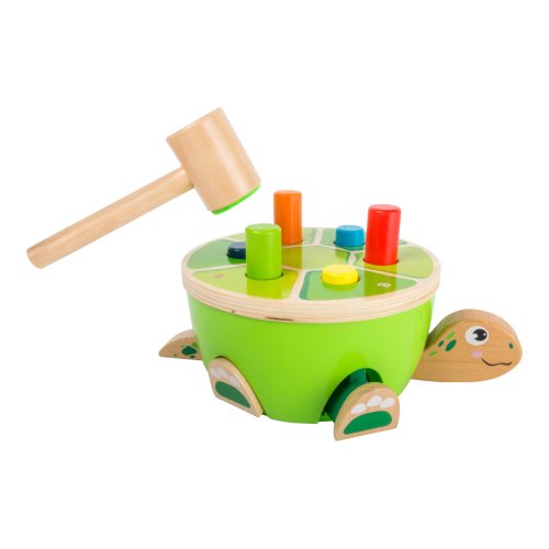 Želvy, dávejte si pozor! Tato originální zatloukačka zábavným způsobem rozvíjí dovednosti a soustředění našich nejmenších. Děti mohou prokázat jak svou obratnost tak svou přesnost. Dřevěné kladivo je opatřeno plstí pro tiché údery. Při úderu na jeden barevný dřevěný kolík se automaticky vysune další. Nohy, hlava a ocas želvy se natahují po úderu z každého kolíčku. Motorická hra, která bude bavit! Hlavní vlastnosti: rozvíjí dovednosti soustředěnítrénuje koordinaci ruka-oko a motorikuoriginální zatloukačka