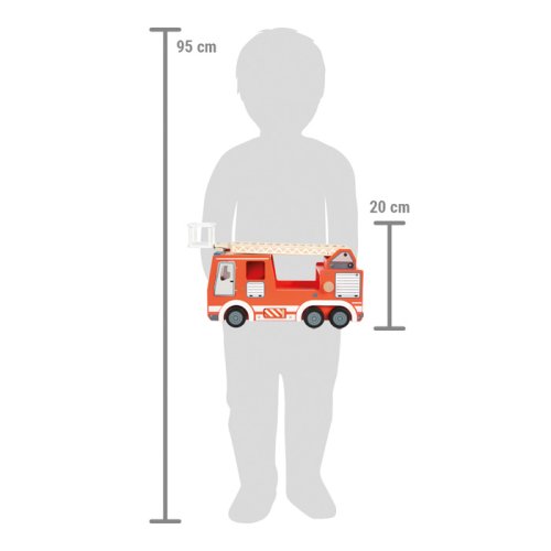 Velké hasičské auto, které přijede na místo, co nevidět! Navíc zaujme svými detaily a robustním zpracováním. Výsuvný žebřík s košem, který lze otáčet o 360 stupňů, umožňuje záchranné práce ve vysokých výškách a díky magnetu žebřík bezpečně uzamkne na místě. Výsuvné podpěrné nohy poskytují stabilní základnu, zatímco navíjecí hadice s magnetickým systémem a odpovídajícím hydrantem je připravena na akční hasičské mise. Otevírací střecha poskytuje úložný prostor pro širokou škálu příslušenství. V kabině řidiče s pohyblivými dveřmi je také dostatek místa pro přiloženou figurku hasiče (ohebná panenka s pohyblivýma rukama a nohama). Pogumovaná kola zajišťují tichou a bezpečnou cestu na místo další mise. Ať už se jedná o zabezpečení míst nehod pomocí bariérových zábran nebo o hašení požárů pomocí zatahovací hadice a rozprašovače vody, tato herní sada nabízí nespočet možností pro kreativní hraní na téma hašení požáru a záchrany. Funkční a detailní design zajišťuje obzvláště autentický zážitek ze hry.Hlavní vlastnosti: obsahuje 1 hasičský vůz s žebříkem a hadicí, 1 ohebnou figurku, 2 dopravní výstražné kužely, 3 zábrany, 1 výsuvný stojan, 1 hydrant, 1 plstěný oheňideální pro fanoušky autíček a hasičůpevné dřevo, zaoblené hranyrealistický designdo auta se vejde figurkapohyblivý žebříktichá pogumovaná kolečka