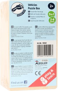 Obrysové puzzle s motivy dopravních strojů pro nejmenší děti! Puzzle jsou baleny v dřevěné krabičce s vysouvacím víčkem, na kterém jsou znázorněny jednotlivé dopravní prostředky. Balení obsahuje celkem pět puzzle obrázků s různým počtem dílků. Dílky jsou robustní a tedy vhodné pro malé prstíky a první skládání. Skládání podporuje rozvoj fantazie a má příznivý vliv na jemnou motoriku. Vhodné pro děti od 2 let.