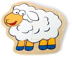Balení obsahuje 4 odlišné puzzle motivy (4 dílky kačenka, 5 dílků kravička, ovečka a kohout). Dřevěná podložka usnadňuje přenášení a rámeček zabezpečuje, aby dřevěné dílky držely na svém místě. Baleno v dřevěné krabičce s průhledným víkem.