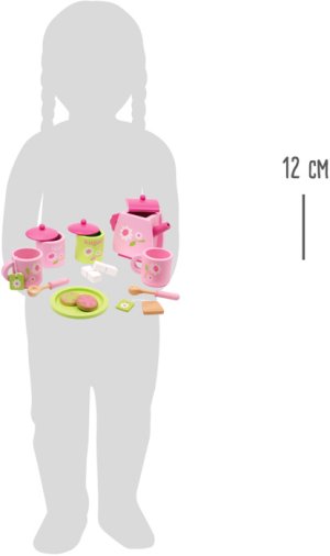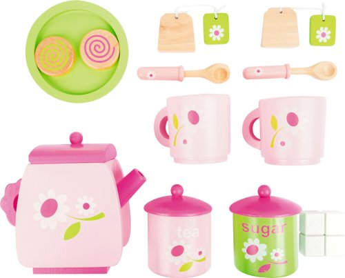 V jemně růžové a pastelově zelené barvě jsou dva šálky s víčkem, konvička, cukřenka a hrnečky na čaj, pastvou pro oči při čajovém dýchánku. Čajový servis s jemnými květinovými motivy doplňují dvě lžičky, dva čajové sáčky, dvě kostky cukru i talíř a dvě sušenky. Konvička, dóza na cukr a čaj mají odnímatelé víko. Hlavní vlastnosti: jemný květinový designpodporuje kreativitu a sociální dovednosti vyrobeno z odolného dřeva pro dlouhotrvající zábavuskvělý doplněk do dětské kuchyňky