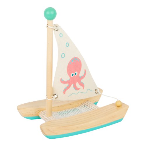 Dřevěná loďka pro všechny malé námořníky. Hračka je vyrobena z kvalitního dřeva a barvena v pastelových tónech. Na plachtě má loď vyobrazenou chobotnici. Rozměry katamaránu jsou cca 16 x 12 x 19 cm. Vhodné pro děti od 2 let.