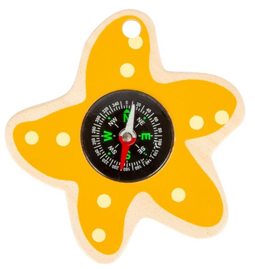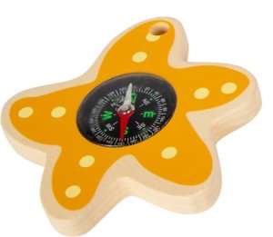 Funkční kompas usazený v dřevěné hvězdici. Rozměry hračky jsou cca 10 x 10 x 1 cm. Vhodné pro děti od 18 měsíců.