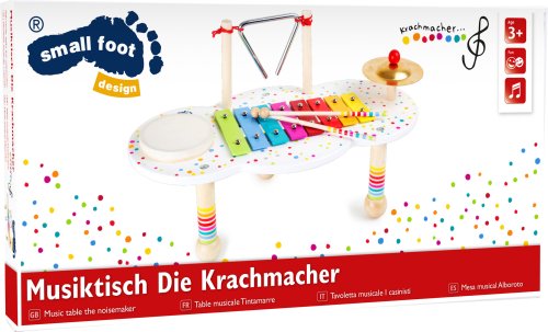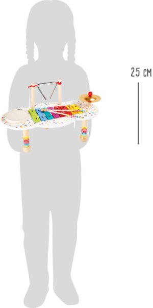 Stabilně konstruovaný dřevěný hudební stolek se třemi nohami dokáže nabídnout širokou škálu hudebních zážitků. Trénuje smysl pro rytmus a první porozumění zvukům. Vizuálně atraktivní kombinace přírodního dřeva a pestrobarevného designu dělá z tohoto stolku přitažlivý kousek vybízející k objevování. Nejedná se o hudební nástroj, ale o hračku. Hlavní vlastnosti: stoleček obsahuje triangl, xylofon, činel a bubínekrozvíjí jemnou motoriku a kreativituhravý úvod do světa zvuku a rytmuklapky xylofonu vydávají odlišné tóny